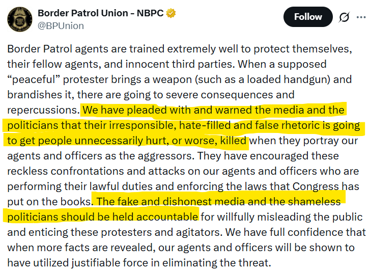 It turns out that when your political leaders demonize federal agents and reward confrontation with sainthood, people start doing incredibly stupid things. And sometimes those stupid things get them killed. See BLM in your history books.
