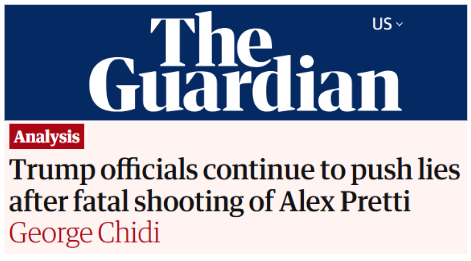 “Masked Government Thugs Snuffed Out Alex Pretti’s Life In Broad Daylight,” The Guardian proclaimed, priming the outrage pump before the facts even landed.