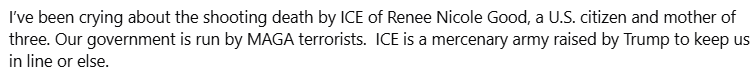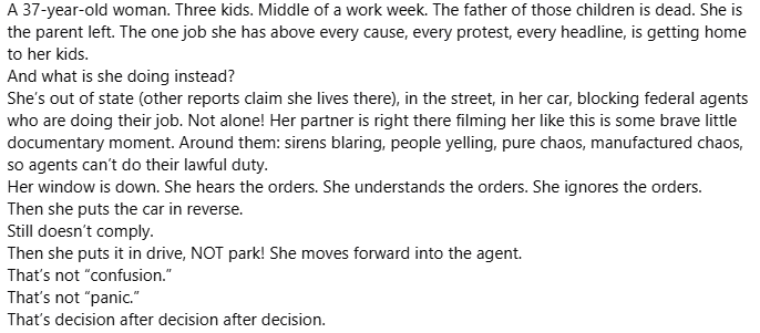 Allow me to comment as a law enforcement spouse. My husband was a police officer in Norfolk, Virginia for 5 years, where we buried 3 of his friends who were killed in the line of duty and has been with Louisville Metro Police Department for 18 years, including several years as a homicide detective (including 2020 when Breonna Taylor was killed by a police officer after her boyfriend shot a cop who was serving a warrant in the femoral artery). What non LEO families do not understand is that the narrative around police shootings by the media is always one sided and always makes the officer the villain (except in the case of Michael Byrd, who killed Ashli Babbitt). Some of the past narratives have never been corrected, and friends of mine still believe the "hands up don't shoot" narrative about Michael Brown (later determined to be a justified shoot by the cop). They still believe Breonna Taylor was an innocent EMT, not involved with drug dealers and some even believe the cops served the warrant on the wrong house and that they did NOT knock (they knocked repeatedly, which was their mistake in hindsight). Renee Good was a victim of indoctrination by Democrats, including their media, and she was used as a pawn by a highly funded group of radicals who want to see the American experiment fail, i.e. Marxists. I pray that my husband never gives a person the benefit of the doubt if he finds himself in a situation where a person is apparently prepared to use a 4 ton vehicle as a weapon. While he says he would have used different "tactics" and likely would not have been in this position, the reality is that she was told to get out of the car, and she did not comply. She made several decisions that day that unfortunately led to her death. Lastly, Minnesota is corrupt. If you have not watched the documentary about George Floyd, produced by Liz Collin and others, I highly recommend it. Liz basically lost her job as an anchor at a local news station in Minneapolis, because she was married to a cop and was not willing to lie about what happened. https://www.thefallofminneapolis.com