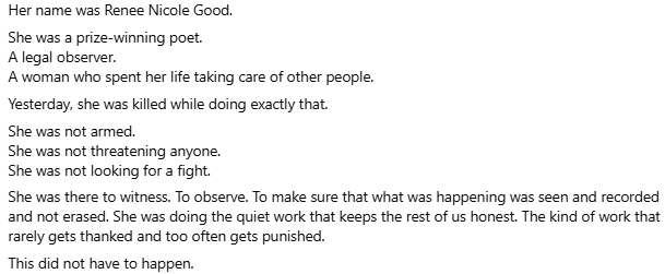But truth doesn’t live in the fairytale land of Either/Or. It lives in the massive gray area in between where countless realities can exist at the same time: a woman can be unjustly killed and also make choices that put herself in danger; an officer can feel threatened and also still make bad judgment calls and strategic errors; activism can be rooted in good intentions and also be catastrophically ill-conceived. But none of that fits neatly on a protest sign or a chyron, and arguing in absolutes is the reflex we’ve been conditioned to perform.