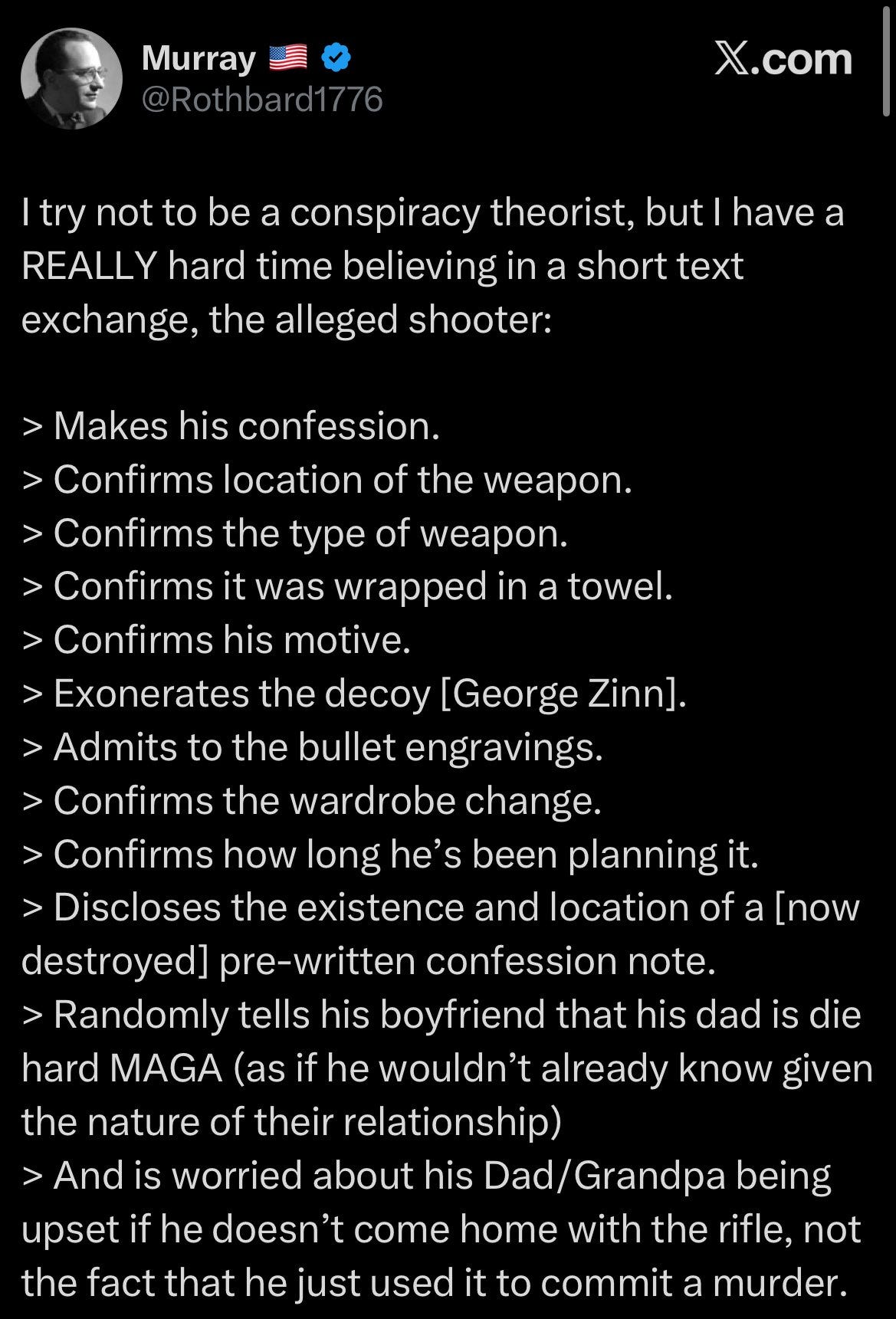 The theories online are downright wild. The CIA and Mossad did it. As a “favor” to Erika Kirk, who is also Mossad. (Trump was somehow involved.) Erika was also trafficking children out of Romania and she may, in fact, be JonBenét Ramsey *I am not making that up*. No, the U.S. Army killed him. It was a palm gun! Wait, it was a drone. What? You’re all insane. It was obviously a ritualistic, deep-state cult murder. Please. It was all a fake; an elaborate Hollywood production. Hahahahaha just kidding, the entire thing was a hologram.
