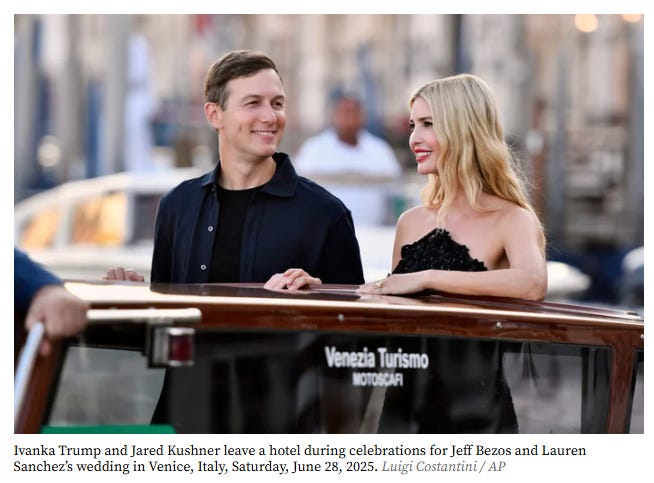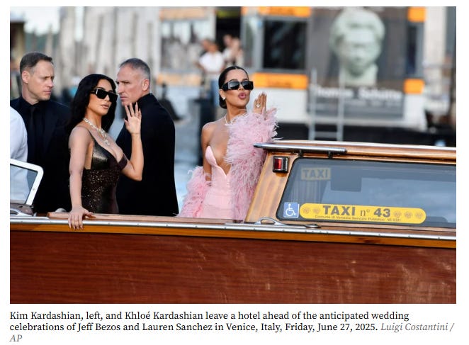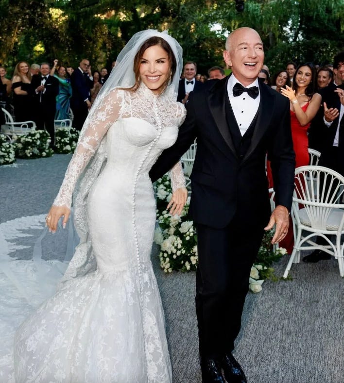 In case you were busy cleaning out your composting toilet or perhaps enjoying a digital fast this past weekend and missed the news: Mega-mogul Jeff Bezos married his astronaut fiancée Lauren Sánchez in a [searches universe for word that means ultra-extra-stupid-lavish] $50 million blowout in Venice. The star-studded guest list looked a lot like the Epstein flight logs featured luminaries like Oprah, Kim and Khloé Kardashian, Ivanka Trump, Orlando Bloom, Tom Brady, and Jordan’s Queen Rania—to name a few—which I guess really ticked off a whole brood of B-listers who didn’t make the cut.
