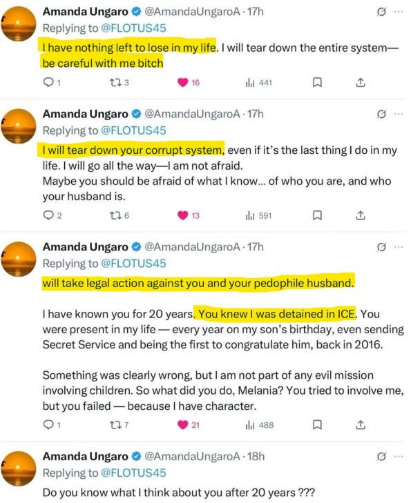 That was last summer. After her arrest, Ungaro spent three and a half months in an immigration detention center before being sent back to Brazil “in her prison uniform, with nothing, not even a cell phone.” Details about how she passed the next five months are scant, but this week, she popped up on X to taunt FLOTUS in a series of increasingly unhinged tweets (that have since been memory-holed completely).