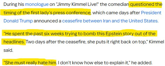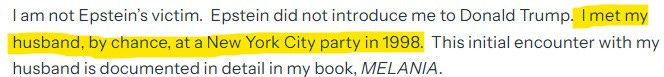 Apparently, after umpteen months of Epstein-related accusations, FLOTUS felt compelled to announce that she knew nothing about the man’s nefarious activities, was not his friend, found everything about him repulsive, and that any claims to the contrary—current or forthcoming, presumably—are nothing but filthy, disrespectful, mean-spirited lies.