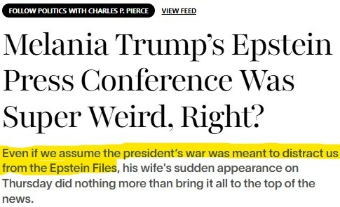 So once again, we’re back where we were before the latest promise-of-a-bombshell: in that familiar media-loving place where everything Trump does is to pivot attention to literally anything but Epstein. (*Except when Epstein is the pivot. Try to keep up.) He gives a speech? Distraction. Doesn’t give a speech? Detour. His wife gives a speech… about Epstein? Decoy. Starts WWIII? Duh. All I know is that for a supposedly-dead guy, Jeffrey Epstein has an uncanny ability to dominate the news cycle.