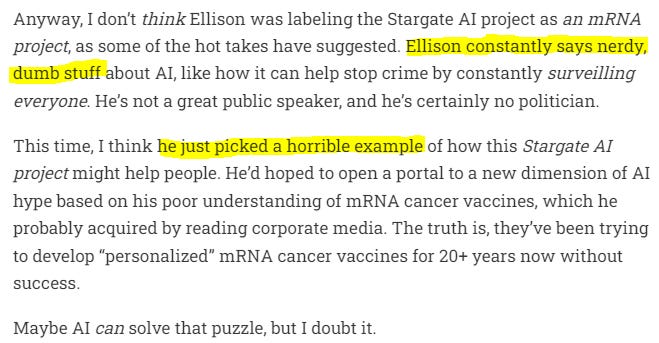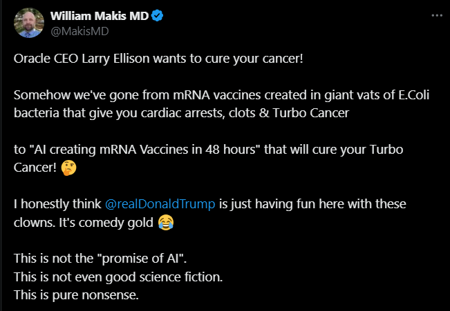 Surely you already know the answer absent of my little poll, and the gist is this: These Doctors of Technocracy (Oracle CTO Larry Ellison, OpenAI co-founder Sam Altman, and Softbank CEO Masayoshi Son) believe that AI is going to revolutionize healthcare by—wait for it—being able to analyze a blood sample to detect cancer and then within 48 hours [Operation Ultra Mega Quantum Mach Speed Plus!] creating a personalized mRNA vaccine for that unique individual that will obliterate only the harmful cells. Go ahead and ring that bell, baby—you’re cancer-free the same week you were diagnosed! All the vaccines for thee! Squee! (*It ain’t free!)