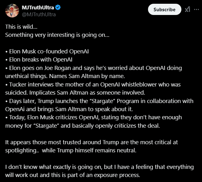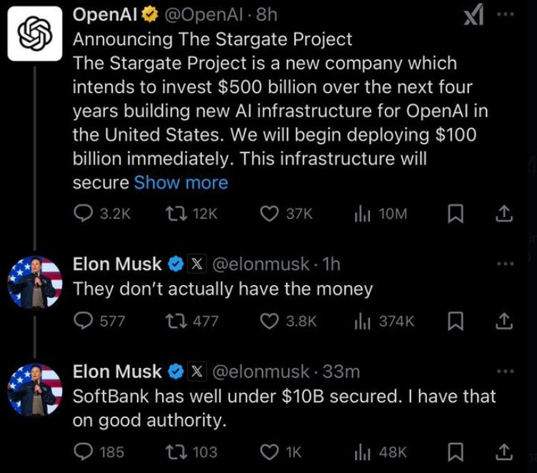 Interestingly, Elon Musk (who’s an official part of Trumplandia unlike the not-plumbers) is publicly pooh-poohing the Stargate Project.