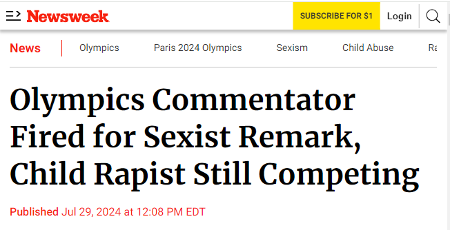 Newsweek decided to cover the misogynistic mishap in a bizarre combo story where the career-ending quip was deemed the bigger scoop than a child rapist being allowed to compete in the Games.