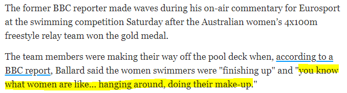 But you’ll be relieved to know that the networks are finally cracking down on incompetent, impotent reporting. This week’s scapegoat was the BBC’s Bob Ballard, who had the audacity to suggest—right on camera—that women (I guess we know what those are now?) sometimes keep other people waiting while they powder their delicate little noses or something.