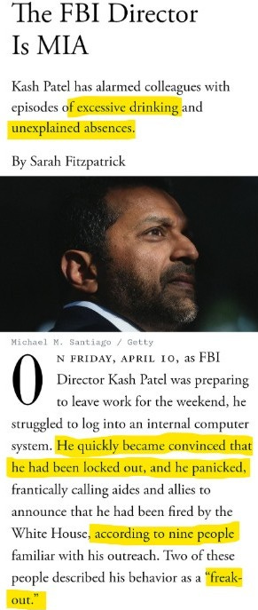 On Friday, the once-respected rag dropped a hit job on FBI Director Kash Patel that basically paints him as an erratic, paranoid, unhinged mess who gets aggressively hammered so often that his own security detail has had to use SWAT gear to break into his room to make sure he’s alive. The… reporting… featured two dozen unnamed sources, lots of hallway whispers, the whole “people familiar with the matter” starter pack. The implications were far from subtle: this is a guy who shouldn’t be running a mall kiosk—let alone the FBI—and is probably one bad happy hour away from losing his badge.