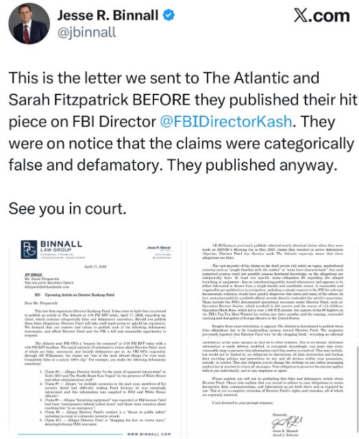 We’re talking a full-on, $250 million defamation lawsuit filed in federal court, accusing The Atlantic of publishing “false and obviously fabricated allegations” after being warned, in writing, that the claims were untrue.
