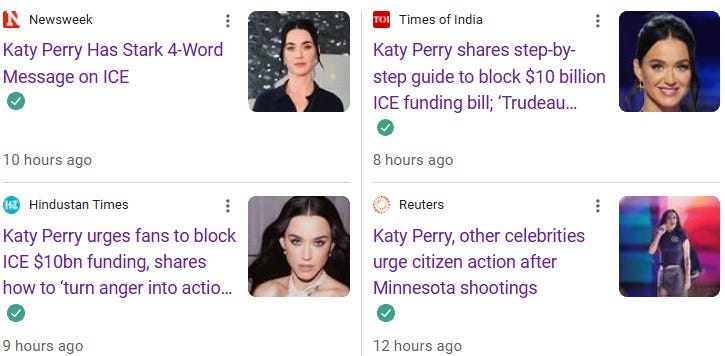 Let’s also not gloss over the fact that Perry is now romantically involved with Justin “Brownface” Trudeau, the guy who froze the bank accounts of people and businesses who supported the Canadian Trucker’s “Freedom Convoy” protest. And now she’s appointed herself America’s resistance leader and urging *you* to protest ICE. (WHY?