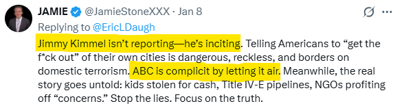 Kimmel framed the situation in Minneapolis as “very dark stuff” before pivoting smoothly to the “bright spot”: civilians filming ICE agents sliding on frozen sidewalks, struggling with vehicles, or wiping out while exiting a porta-potty. Cue the laughter. Hold up the applause card. Whisper the soft, reassuring message that these people deserve derision—maybe worse—because they wear the wrong jacket.