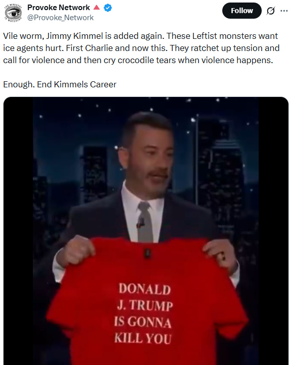 At one point in his monologue, Kimmel held up a shirt reading DONALD J. TRUMP IS GONNA KILL YOU, suggesting it as appropriate attire for ICE agents.