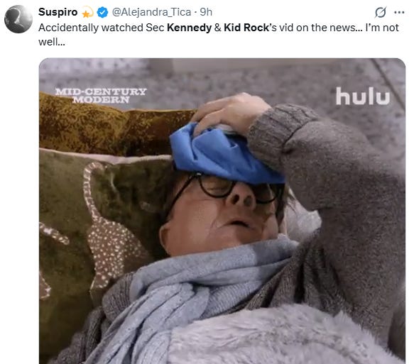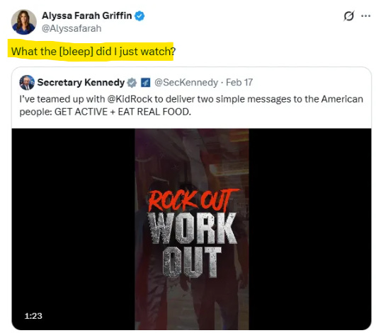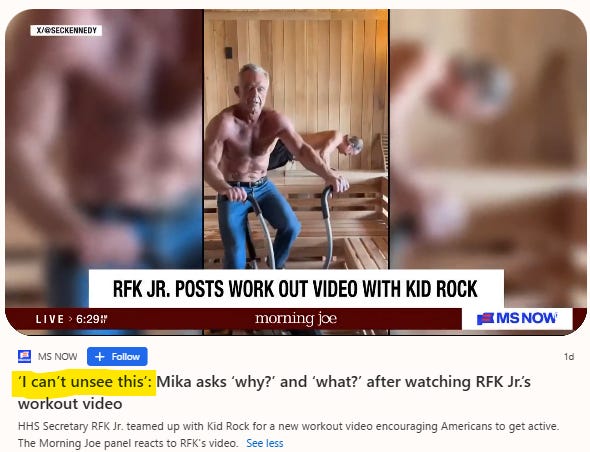 So even when someone shares the clip with a string of puke emojis or just a single-word caption (“Cringe”); when Stephen Colbert turns it into a “senior softcore” bit; when you’ve got USA Today calling it “an erotic workout video,” I think it’s safe to say it’s doing its intended job: namely, hitting folks over the head with the eat-real-food-move-your-body MAHA message through sheer cultural osmosis. Eyeballs are the currency—and the click-counter is agnostic. Loved it? Click. Loathed it? Click. Shared it with your WhatsApp book club so you could skewer it as a group? Clickity-click-click—cue the tap dance outro and the NOW TRENDING tag on X.