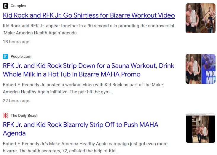 This week, Robert F. Kennedy Jr.—the actual United States Secretary of Health and Human Services—dropped a shirtless “Rock Out Workout” montage with Kid Rock (yes, that Kid Rock), complete with milk-chugging, cold-plunge jeans, a hip-hop scratching soundtrack, and a middle finger straight to camera.