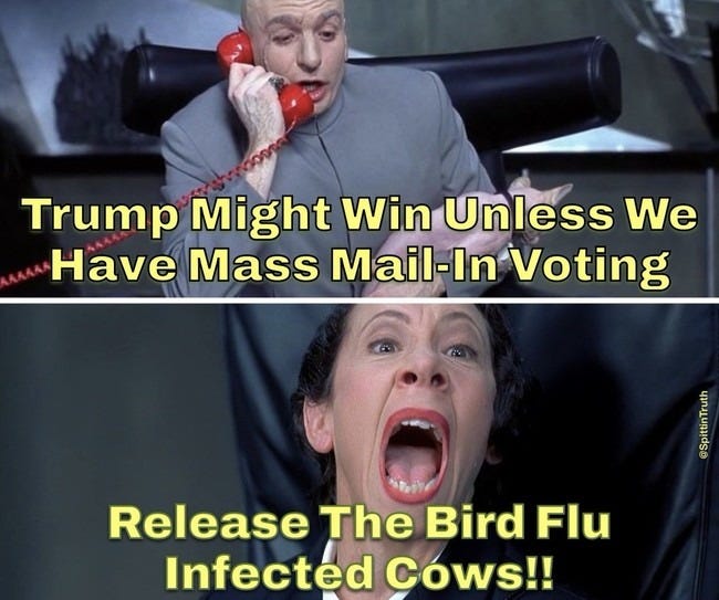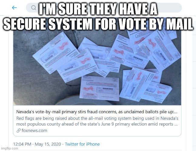 Over the years—almost always in response to “wartime necessity”—the system got stretched. First it was mainly for active military. Then anyone “vulnerable to attack” who might be afraid to leave home on Election Day. Then traveling salesmen and railroad employees. As people became more mobile, rules loosened. Exceptions multiplied. Deadlines blurred. And then Covid hit—remember how they constantly compared it to a war?—and we were all supposed to pretend the virus would kill us all if we stood in line together to vote (but not if we were positioned on a little yellow arrow in a grocery store six feet away from the next shopper, sitting maskless in a crowded restaurant, or part of a BLM protest). In other words, what started as a practical accommodation turned into a postal free-for-all that election scholars will be debating until the sun burns out.