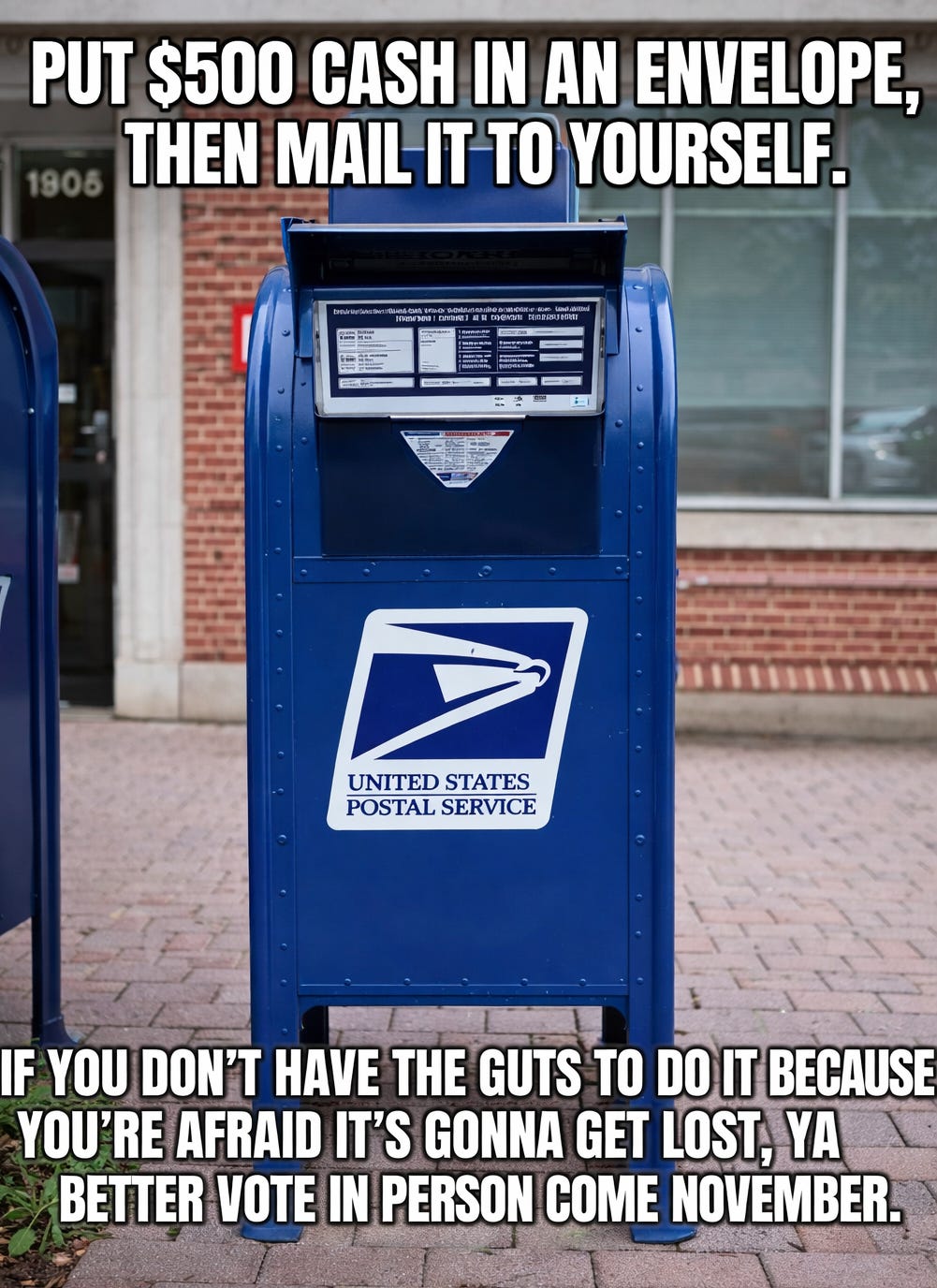 Call me crazy, but what if we went back to what actually made sense: in-person voting as the default. If you can get to the grocery store, Target, your kid’s soccer game, or the gastroenterologist’s office for your colonoscopy, you can get to a polling place. Make it a national, PTO holiday. For those who genuinely can’t (see above) appear in the flesh, absolutely, allow exceptions. But make them actual exceptions. Apply in advance. Get approved. Mail your submission back by a clear, firm, not-even-close-to-the-deadline date so we’re not all sitting around waiting for ballots to casually wander in like dads in Home Depot.