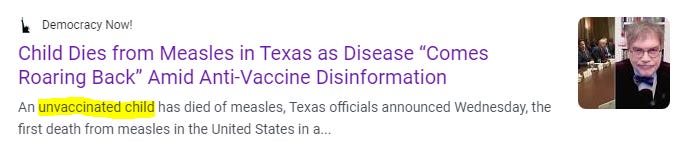 Of course, no outlet supposedly-covering the story has released any additional information about the child; they simply allude to the fact that he or she “had been hospitalized” and “tested positive for measles.”