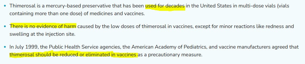 Thimerosal is a mercury-based preservative used to prevent bacterial and fungal contamination. Our “public health” agencies insist there is no evidence that it’s dangerous or linked in any way to autism or any other undesirable outcome. The decision to ban it came after a presentation from Lyn Redwood, former president of Kennedy-founded Children’s Health Defense.