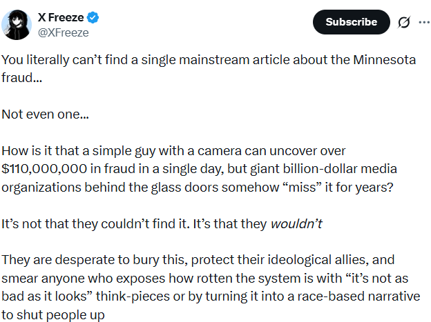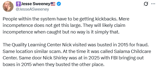 Here’s what it boils down to, as I see it: You’re allowed to say “fraud.” You’re allowed to say “nonprofit.” You’re allowed to say “billions.” You just can never whisper the immigrant-refugee infrastructure that made this scale possible, because that’s the part everyone has spent a decade congratulating themselves for building. It’s the ribbon-cutting, grant-announcing, virtue-signaling ecosystem that lets politicians preen about compassion while quietly outsourcing accountability. Admitting it’s being exploited doesn’t just expose fraud; it unmasks the people who set it up, funded it, protected it, and used it for moral cover.