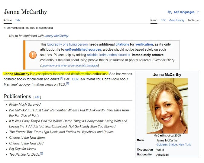 Regulars to Jenna’s Side may recall a casual postscript I tacked onto a recent substack, explaining how an alert reader had tipped me off to the fact that some diligent Wokepedia editors had gone out of their way to update my profile page. I was no longer a “speaker and author,” as I had been described on the supposedly independent, crowdsourced site for more than a decade; I had been promoted to “conspiracy theorist and disinformation enthusiast.”