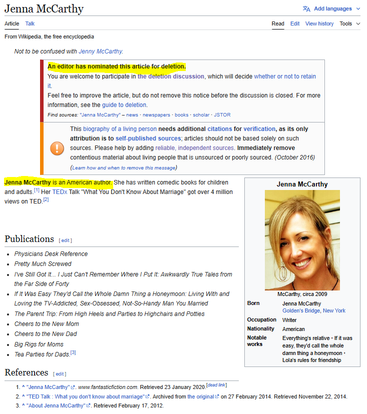 SUBJECT: LIBEL: Jenna McCarthy Wikipedia page