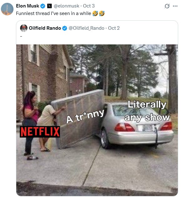 The outrage started when Musk—whose own relationship with “gender ideology” could fill a miniseries—caught wind of Netflix promoting a parade of “Trans Day of Visibility” shows and a now-canceled cartoon featuring a transgender teen ghost-hunter. Having very publicly blamed his transgender daughter’s transition on the “woke mind virus,” Musk didn’t exactly approach the subject with Zen detachment. Instead, he went full flamethrower, regurgitating clips, quotes, and memes faster than Netflix could ask, “Are you still watching?”