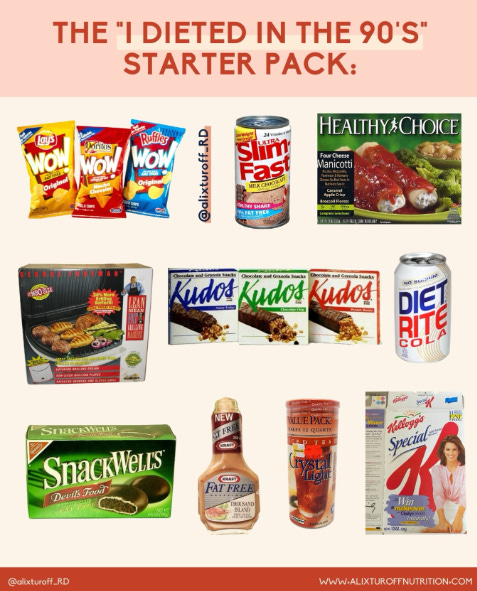 I’ll be honest, I’ve never been a big snacker. For most of my adult life I’ve also been pretty consistently committed to wearing the same size jeans until the day I die. But all of a sudden, snacks didn’t even count—as long as they were fat-free. I hadn’t eaten an Oreo in years, but there I was, deprived of any real food and overcompensating by inhaling SnackWell’s cookies and Healthy Choice ice cream and Lay’s Wow! chips (which warned right on the bag “May cause anal leakage” and we ate them anyway), proudly mistaking digestive distress for discipline. Sure, I might crap my pants, but I could eat an entire trough! With no guilt!
