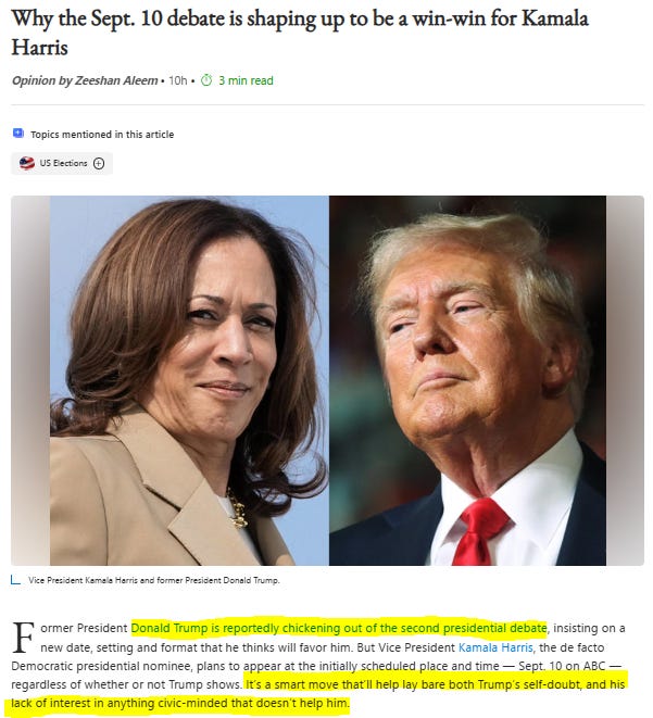 When perusing the MSM for today’s topic, as one would expect, our vapid VP and DJT dominated the headlines. Fair and balanced? Not so much. Take a look—and then tell me if it’d take a super-sleuth to ascertain the agenda.