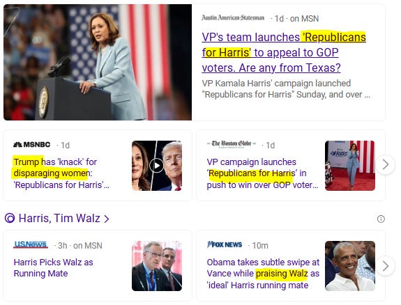 I don’t know if you know this, but people love Kamala. Everyone! Even republicans! Especially republicans. They’re forming official groups just to show folks how serious they are about #BeingWithHer. They’re forsaking their former party—the one that believes in a free market economy and strong national defense and individual liberties—and choosing to champion the poster girl for DEI, defunding the police, and gender affirming care because the media says you’re deplorable if you don’t we’re not going back [to $2/gallon gas, affordable groceries, and a screaming stock market].