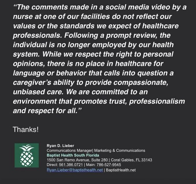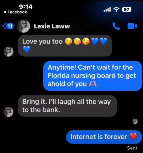 Lawler was gainfully employed at Baptist Health hospital in Boca Raton, Florida when she thought it would be a swell idea to record herself wishing catastrophic perineal trauma on Leavitt, who is expecting her second child. In a record-breaking lapse in institutional cowardice, the hospital promptly fired the foul-mouthed nurse. One can only hope her résumé is permanently watermarked UNEMPLOYABLE in 72-point Comic Sans.