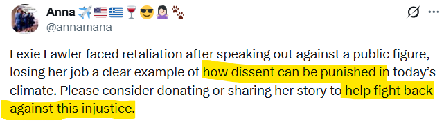 It’s a bold—albeit expected—attempt at putting a defensive spin on the indefensible, but in reality Lawler wasn’t punished for dissent. Her speech had nothing to do with politics. She wasn’t silenced by anyone’s outrage—she was simply deemed unfit to hold a position that requires compassion, conscience, or just slightly more decency than a rabid badger. (But please give her money anyway!) The only thing she is a victim of is her own abysmal decisions.