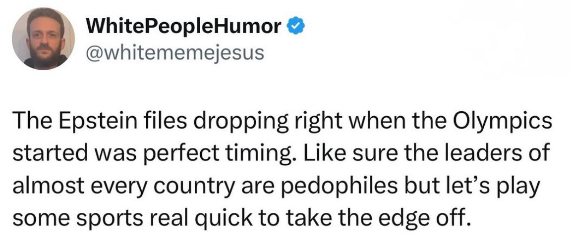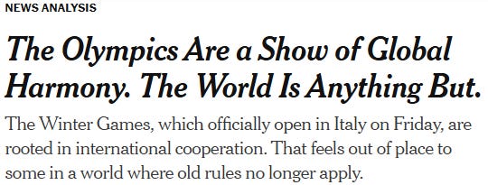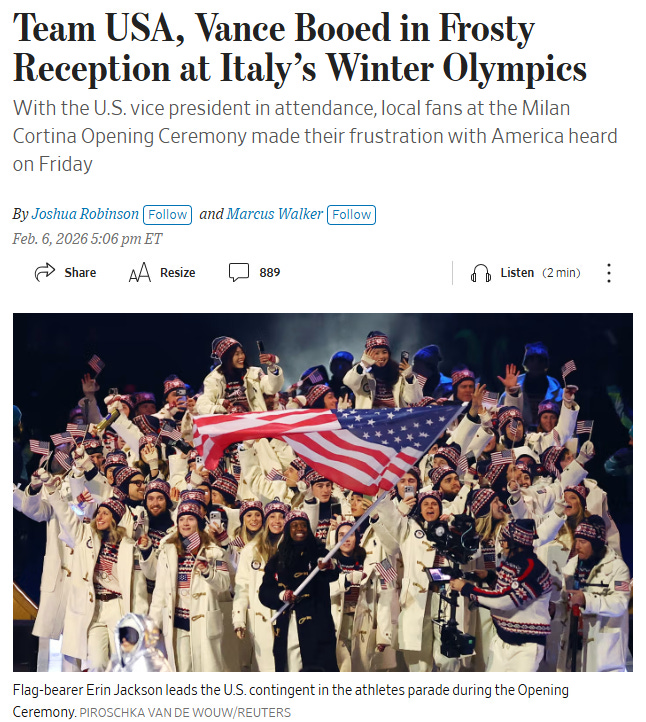 This gap between media hysteria and real-world normalcy is the funniest part. The NYT insists the Games are overshadowed by climate death, the disintegration of NATO, and ICE agents in Milan. The WSJ is breathlessly counting boos like an election-night analyst. Meanwhile, the average Italian vendor is just trying to sell a panini to a family from Missouri.