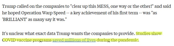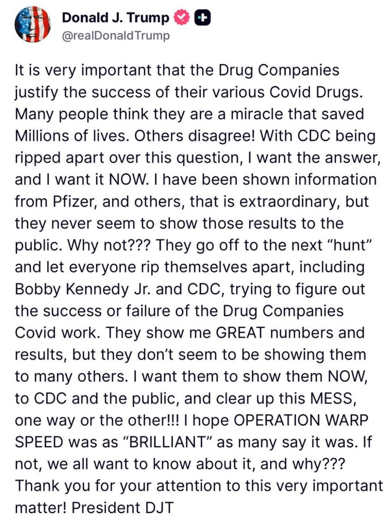 The way I see it, Trump's post about Operation Warp Speed is the medical freedom community's opportunity to explain to President Trump that the Covid-related advice he got in 2020 was terrible. I posted the following on Truth Social yesterday, and I hope many people will post something similar.