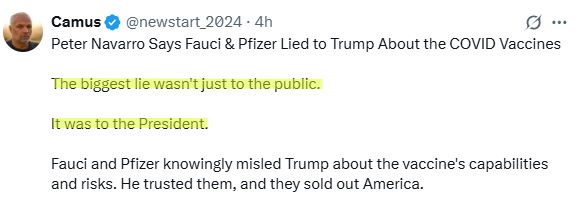 "President Trump, you asked if Operation Warp Speed was a success. The sad truth is that it was not a success. But that was NOT your fault. You were led astray by Anthony Fauci, Deborah Birx, the WHO, the CDC, Pfizer, Moderna, and many others who had perverse incentives for lying to you. And the mainstream media lied and are still lying for Fauci. BIrx, the WHO, Pfizer and the others.
