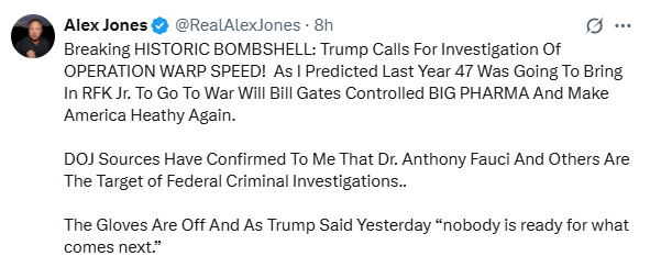 Meanwhile, Fauci is trending on X again, and this time it’s not because “the doctor who became a beacon of hope for millions through the COVID pandemic” [*author throws up in her mouth a little] has released a new compilation of lies book. Just about every single post is calling for his arrest. At the risk of appearing overly optimistic, the guy might want to start practicing the phrase “protective custody,” just in case.