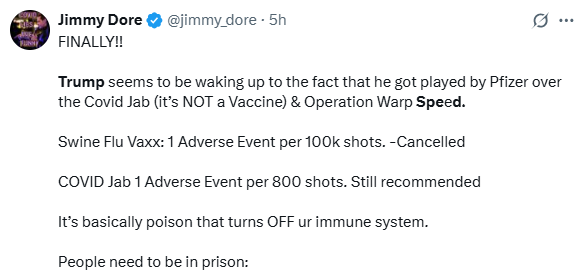 Here’s what regular readers already know: Operation Warp Speed might have been fast, but speed is not the same thing as success. (I could nuke a soufflé in six minutes, but you probably wouldn’t want to eat it unless you’ve got Pepto Bismol on hand and a trashcan nearby.) Maybe Trump realizes that now. Maybe the Overton window just shifted—hard. Maybe TMWNAAABWE was encouraged to dip a swollen pinky toe in the murky waters of perhaps-I-was-wrong-duped. Maybe, as some have suggested, Warp Speed was a strategic roadblock Trump threw up to head off a decade of lockdowns and FEMA camp roundups. [Note to Vee: I said maybe. I’m just collecting opinions here. But check out that video link if you have time and LMK what you think.] Or maybe it’s just another binder full of “stay tuned folks, we’ve got the dirt and it’s gonna blow your minds… next week.”