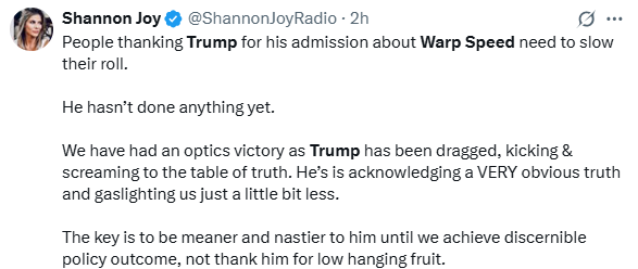 That’s not exactly a victory lap. It’s more like the guy who threw the party asking the caterer, “Wait… wasn’t the chicken supposed to be cooked?” Even MTB was impressed! He’s hedging—putting Warp Speed on the table for inspection—but of course, you’d never know that from the relentless media spin.
