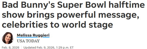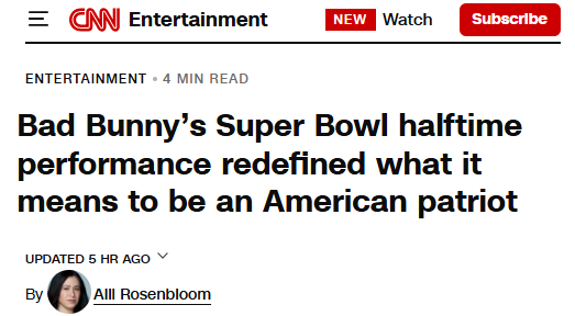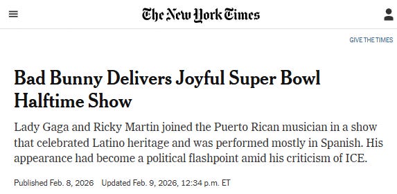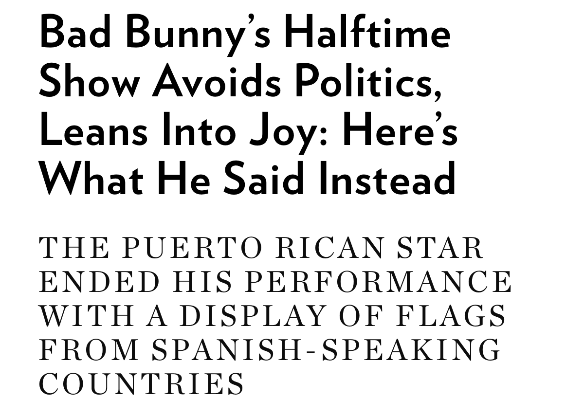 So it was an easy way to generate a culture war and manifest a fake controversy to do two things: allow the Left to bloviate and virtue signal (mission accomplished) and force every social justice warrior and wine mom to watch the Super Bowl just to see Bad Bunny and then make their teary or angry TikTok video about HATE and RACISM and ICE!”