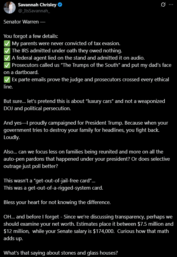 Responding to a jab from Elizabeth “give-me-tax-shelter-or-give-me-death” Warren on X, Savannah wrote: