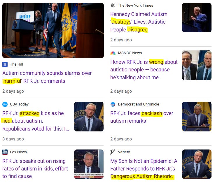 The disconnect from reality in the response to Kennedy’s presser is genuinely impressive. MSNBC ran an opinion piece titled, “I’m autistic, and I work. And I made sure to let RFK Jr. know it.” That would be like a drunk truck driver killing a school bus filled with children and another truck driver penning a moving piece in response to the uproar titled, “I drink and drive all the time. And I haven’t killed anyone yet.”
