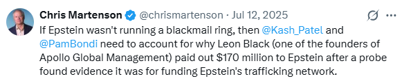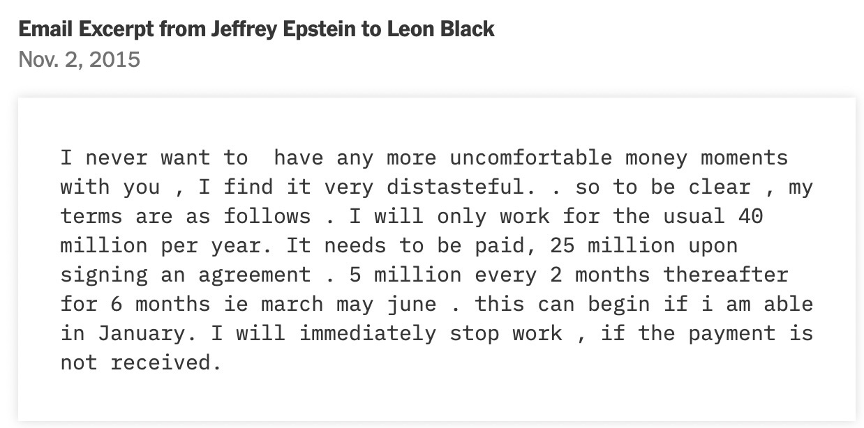 Like lots of Epstein “bombshells” going viral, this is not new information. Much of it has been public since 2021, when Black’s ties to Epstein were initially exposed and he resigned as CEO of Apollo. (His successor, Marc Rowan, wouldn’t-you-know-it, also appears in the Epstein files! It’s such a tiny little rock we inhabit.) Still, none of this was buried in a secret cave.