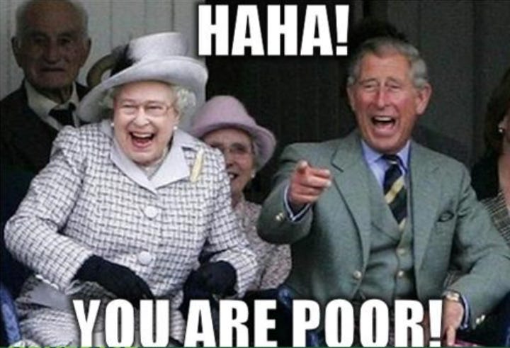 I mean, why is Charles the Prince of Wales when his mother was the Queen of England? How come you only get to be called a lady if your dad is an earl? What even is an earl? Or a duke or a count or a marchioness? And lord? Really? Did they just run out of fancy-sounding secular words? How did vampires get all up in the mix, anyway? (Yes, I realize I could google all of this, but a) I don’t actually care, and b) not-knowing is the new smug.) Why is William the Duke of Cambridge and Harry the Duke of Sussex and Andrew the Duke of York and Edward the Earl of Wessex and seriously you guys, I think they’re literally just over there making shit up.