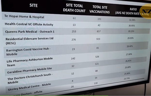 For perspective, New Zealand’s average death rate is .75, meaning that in a given year, seven of 1,000 people would be expected to die. The top ten vaccination sites Young studied saw post-jab fatalities ranging from just under twenty-four percent to nearly thirty-one percent, the top end of that range meaning almost one in every three people who were vaccinated there are no longer living.