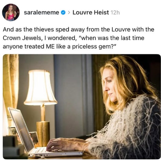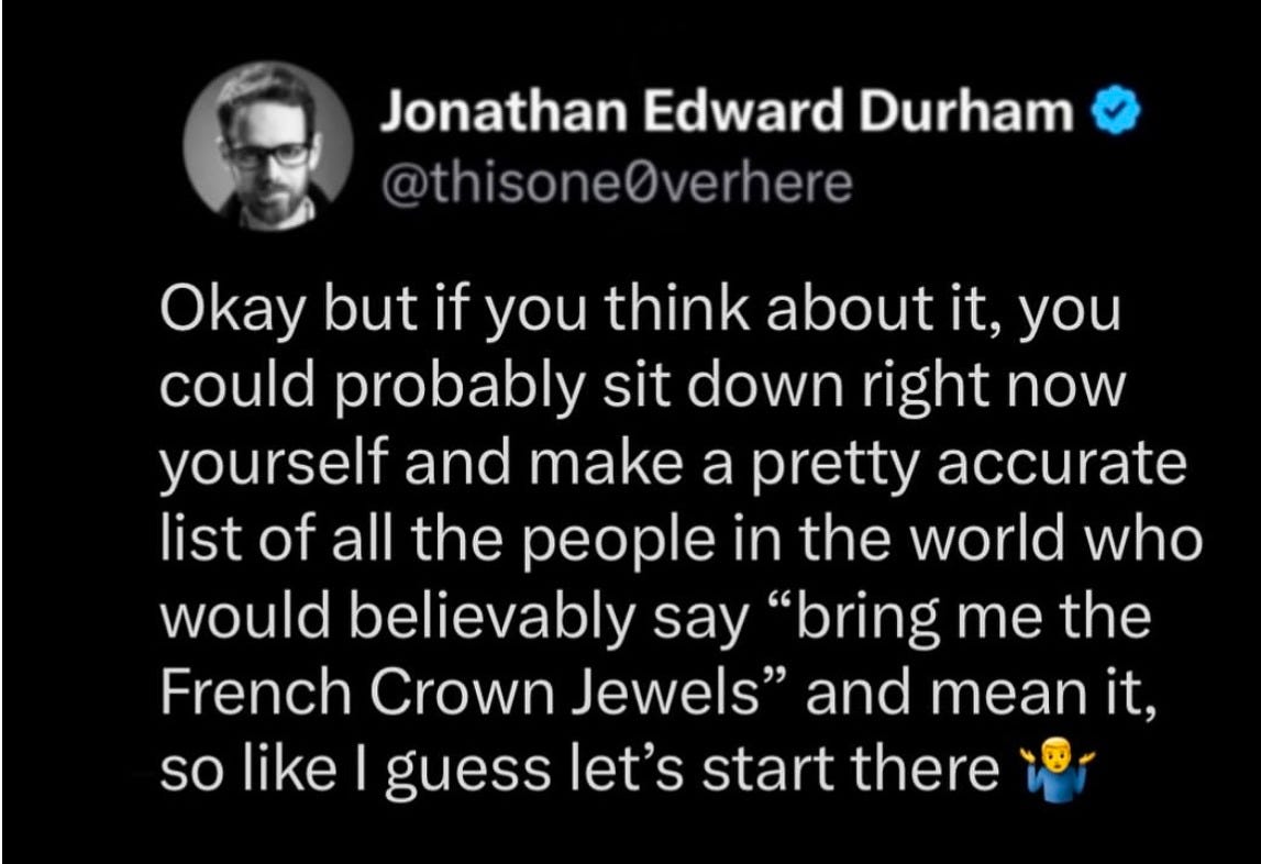In case you somehow missed the drama, four masked thieves rolled up to one of Paris’s most popular landmarks, in broad daylight, on scooters—that’s the part that’s really slaying the kids, BTW—and made off with some colonial-era bling worth about a hundred million bucks. (Seriously, what are they going to do with this not-exactly-discreet haul? List it on eBay? “Gently Used Crown Jewels - One Owner [*Napoleon] - Free shipping!”)