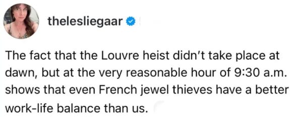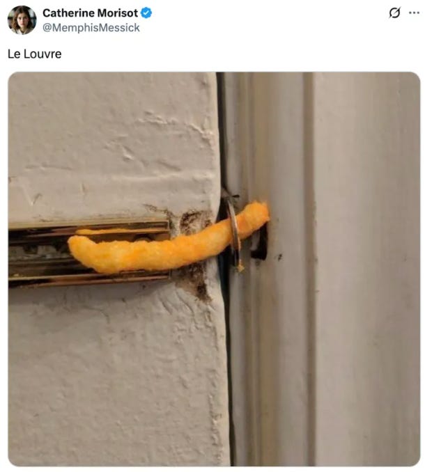 My 20-year-old daughter informed me this week that her generation has a new obsession, and it’s not some fancy skincare line or another stupid bit of viral numerical nonsense. It’s the Louvre heist. Yes, that Louvre. The one with the Mona Lisa, I.M. Pei’s polarizing pyramid, and a stable of security guards who apparently thought “still life” was part of the job description.