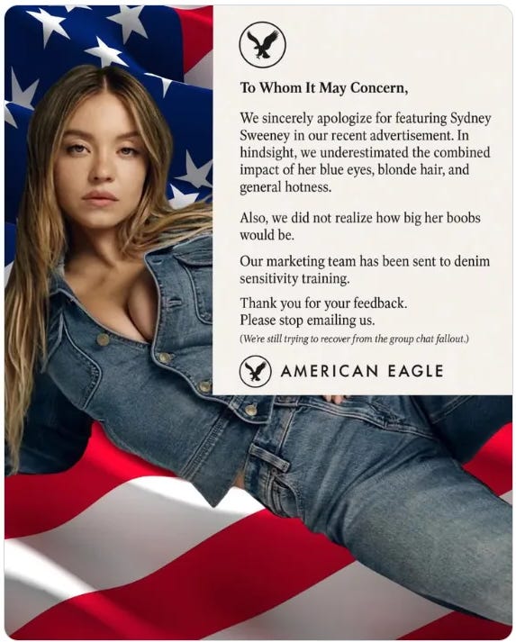 Neither Sweeney nor AE seems bothered by the “bad press,” although unfortunately the hilarious corporate mea culpa that went viral turned out to be fake news.