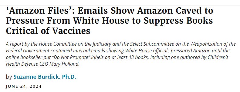 Obviously, I knew all about how the government had pressured social media platforms to censor anti-narrative content during the pandemic. And when The War on Ivermectin was first released, I quickly discovered Amazon had made the title a chore to find (you literally had to type out the entire title before it would appear in the search results; none of my other books had ever experienced this little “glitch”). But—and call me ignorant, naïve, or both—it hadn’t dawned on me that the White House was telling Amazon which books it could should and couldn’t shouldn’t promote.