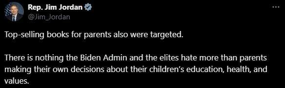 “Whether you love or hate the books on this list,” Republican Representative Jim Jordan said in a tweet, “no bookstore should be censoring books because of government pressure.”